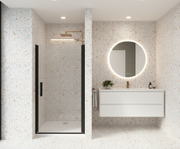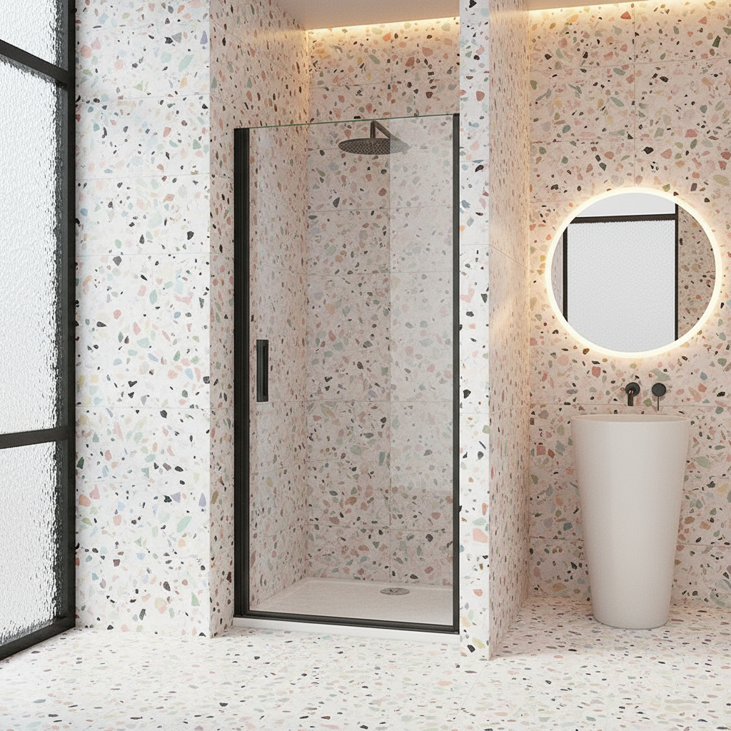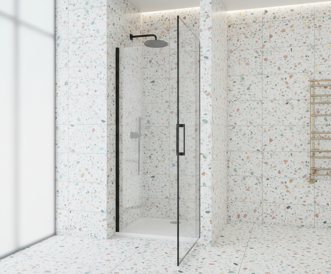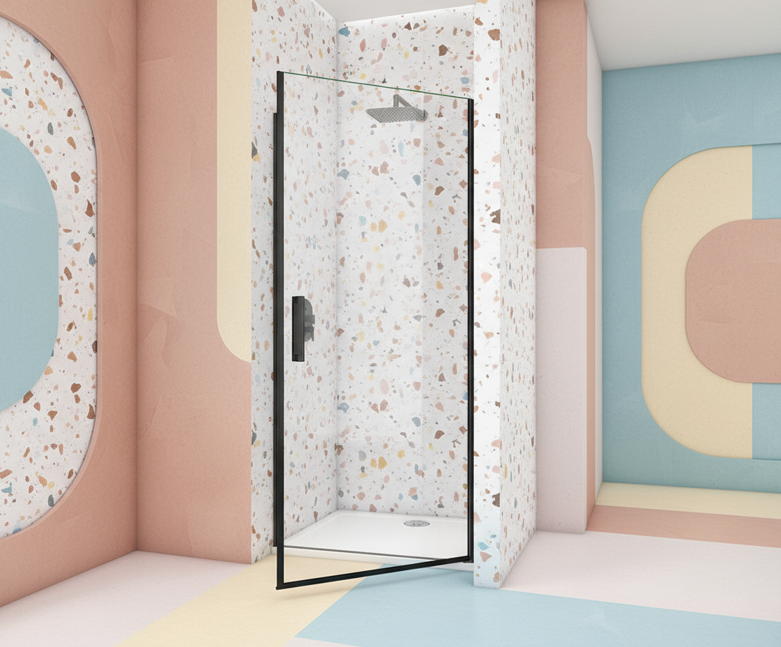 Die Nischentür mit Pendeltür/Schwingtür in Schwarz verbindet minimalistisches Design mit robuster Technik. Das 8mm ESG-Echtglas mit NANO-Beschichtung ist widerstandsfähig und leicht zu reinigen; die Tür öffnet komfortabel für einen bequemen Einstieg.