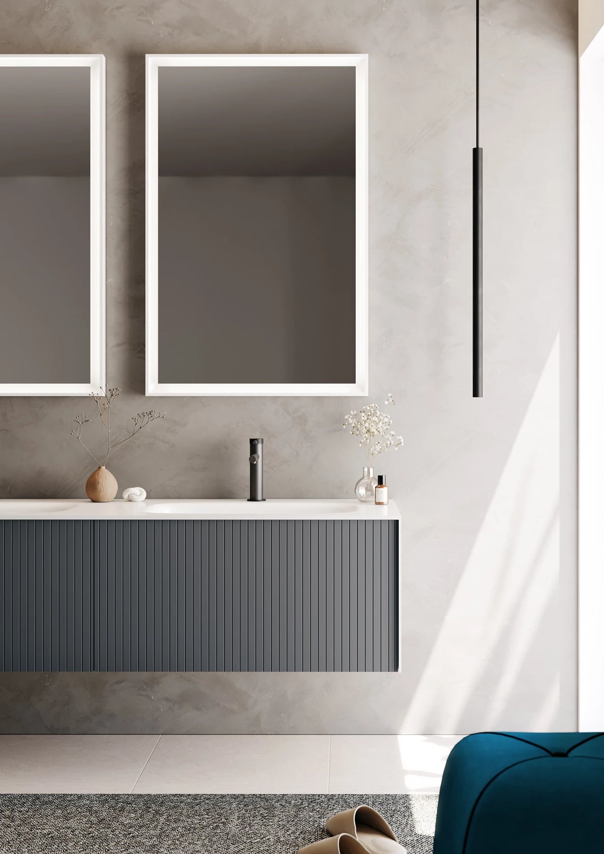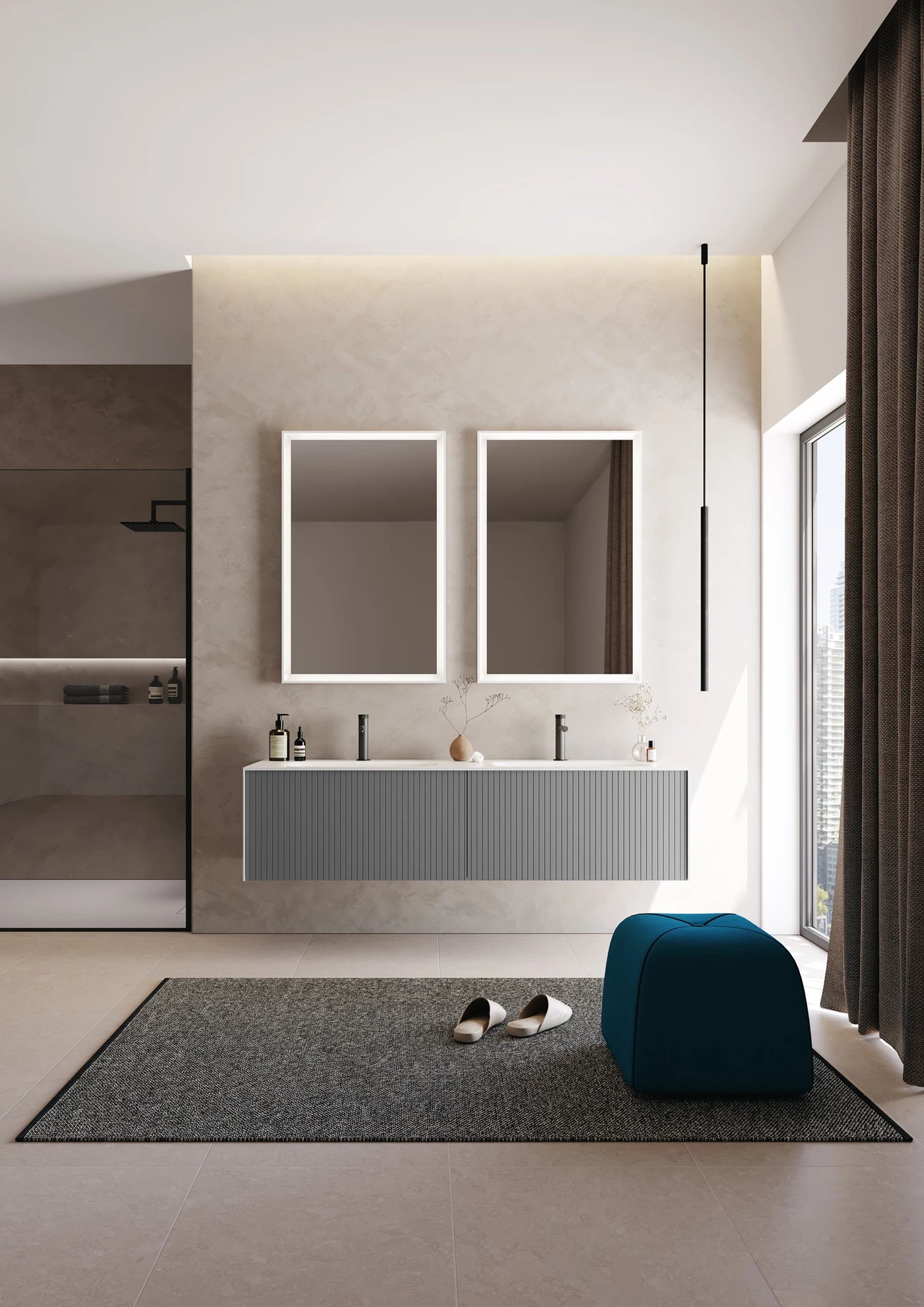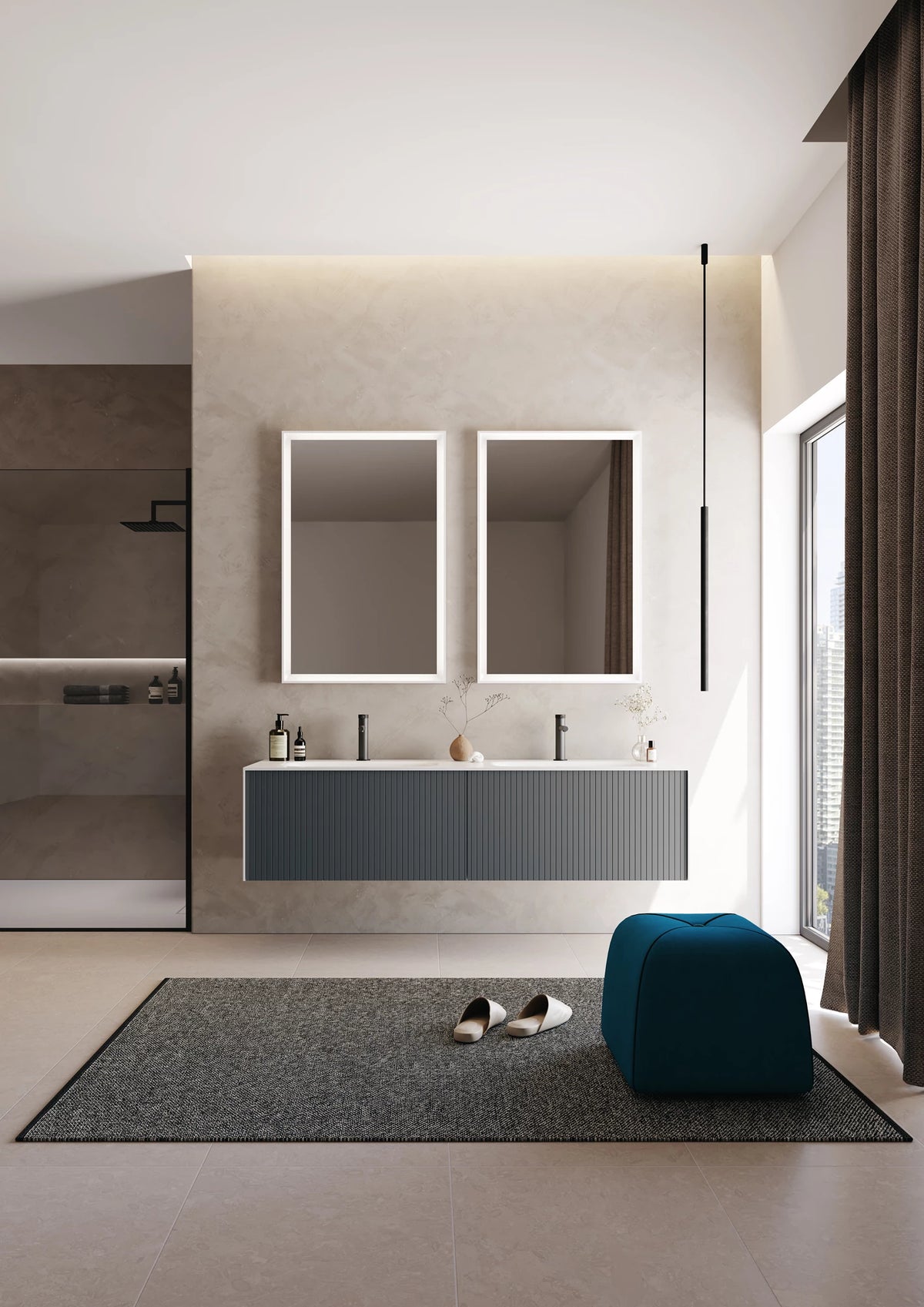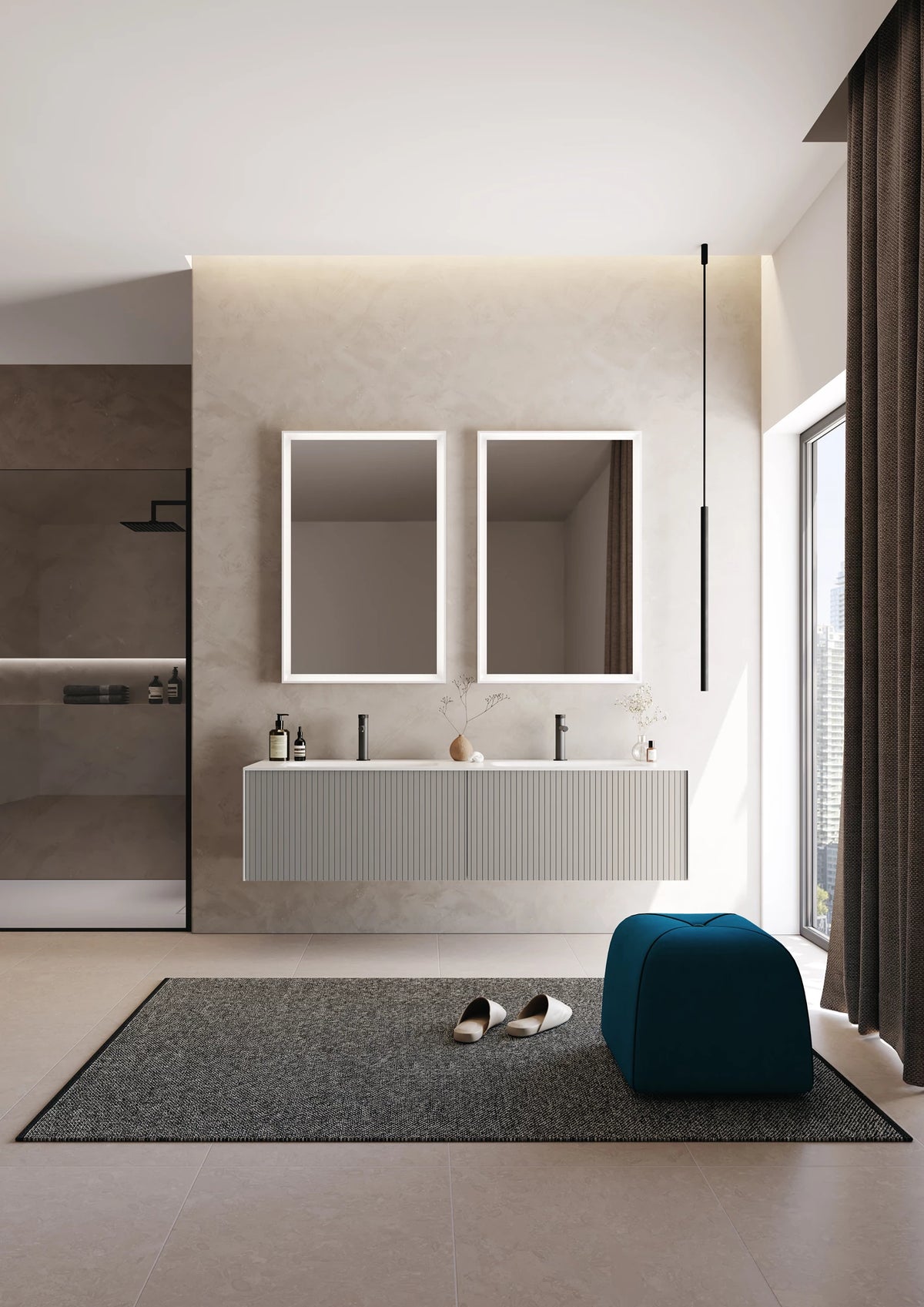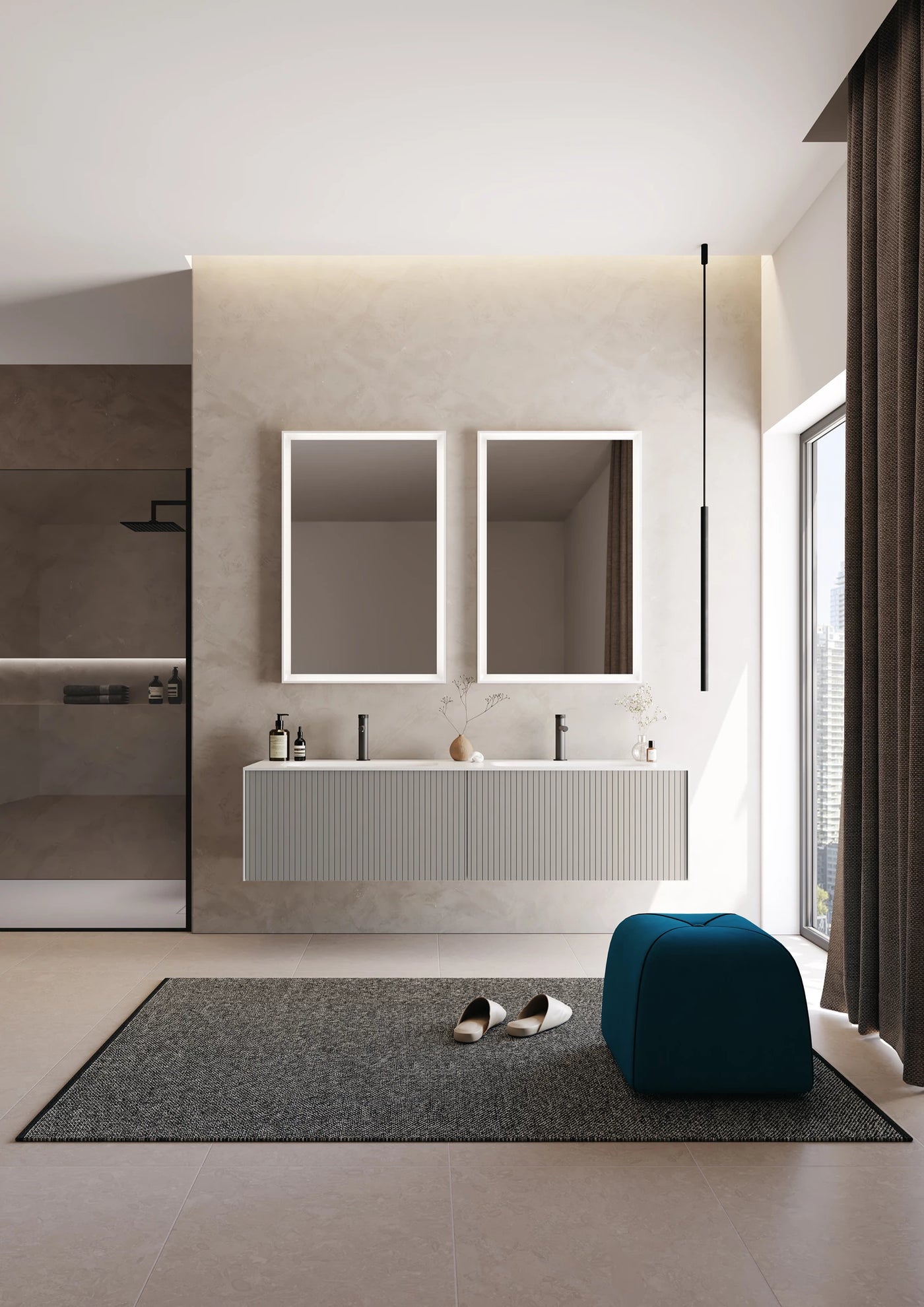 Optional ergänzt ein LED-Spiegel mit Bewegungssensor die CUBE Kollektion. Die Kombination aus klaren Linien, edlen Farben und langlebigen Materialien macht diese Linie zu einer Premium-Wahl für moderne Bäder.