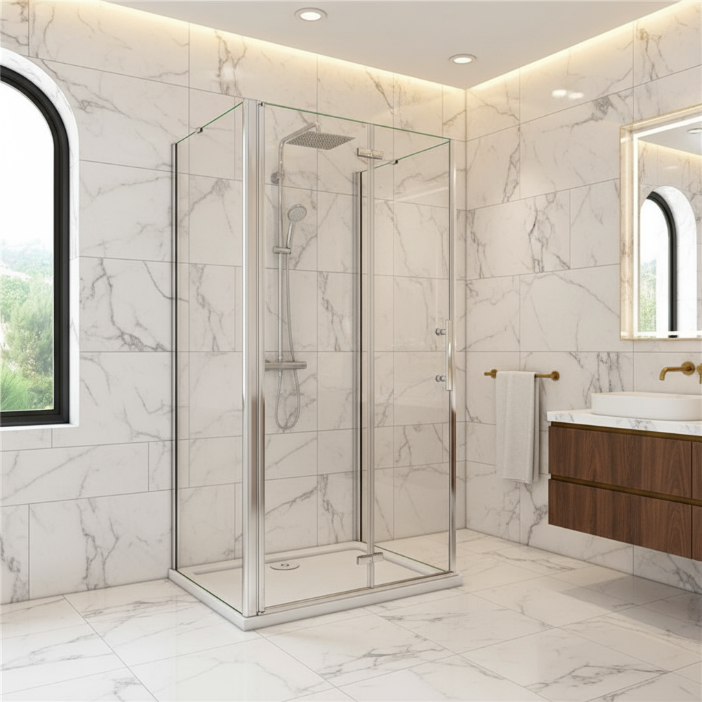 Das ESG-Sicherheitsglas ist robust, stoß- und thermisch belastbar. In Verbindung mit der optionalen Nano-Beschichtung perlt Wasser schneller ab – das reduziert Kalk- und Seifenrückstände und erleichtert die Reinigung. Justierbare Wandprofile aus Aluminium gleichen Toleranzen aus und sorgen für eine dichte, stabile Montage. Magnetdichtungen und präzise Scharniere/Schwellenprofile halten Spritzwasser zuverlässig im Duschbereich.
