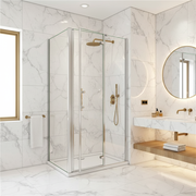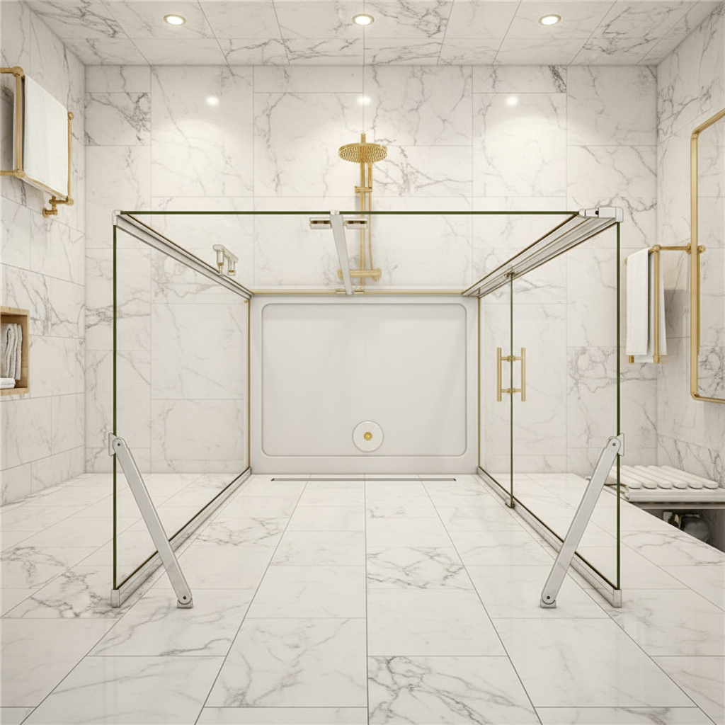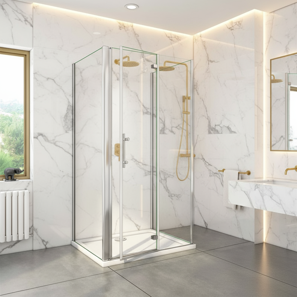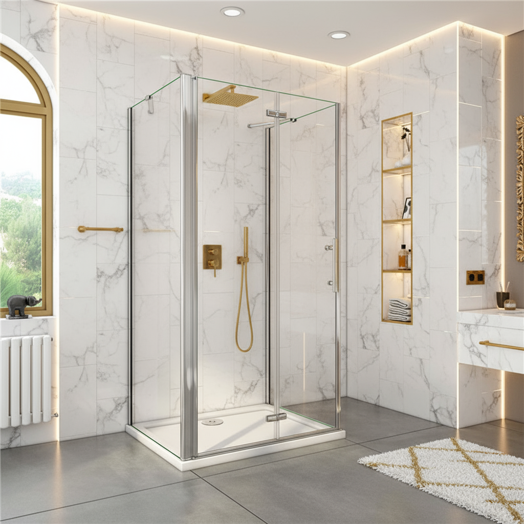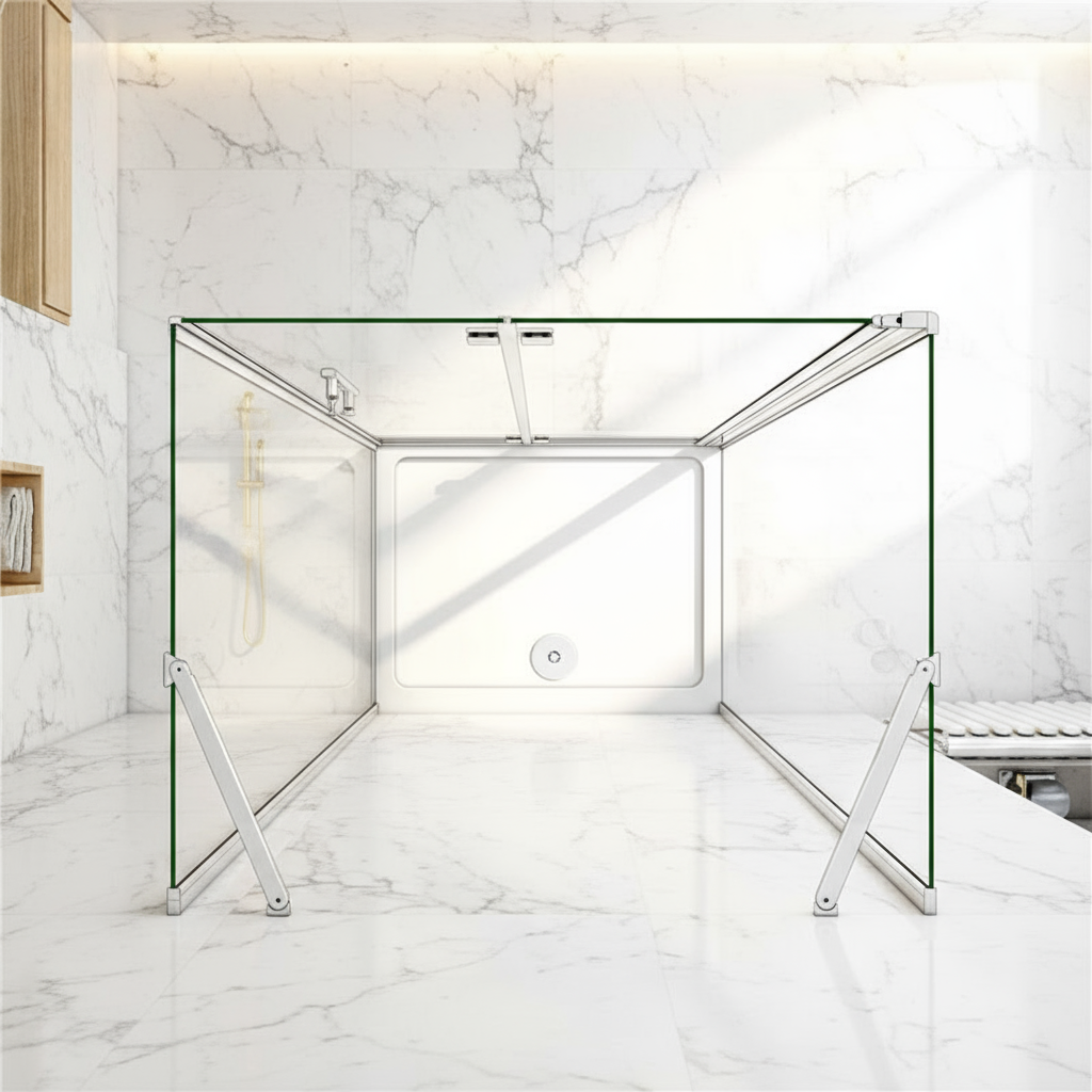 Die U-Duschkabine mit 195 cm Höhe verbindet maximale Öffnungsbreite mit klarer Linienführung. Die U-Form eignet sich ideal, wenn zwei Seitenwände benötigt werden und die Frontbreite flexibel bleiben soll. Wähle zwischen Falttür (180° nach innen/außen klappbar, optimal für kleine Bäder) oder Drehtür (komfortabler, breiter Einstieg).