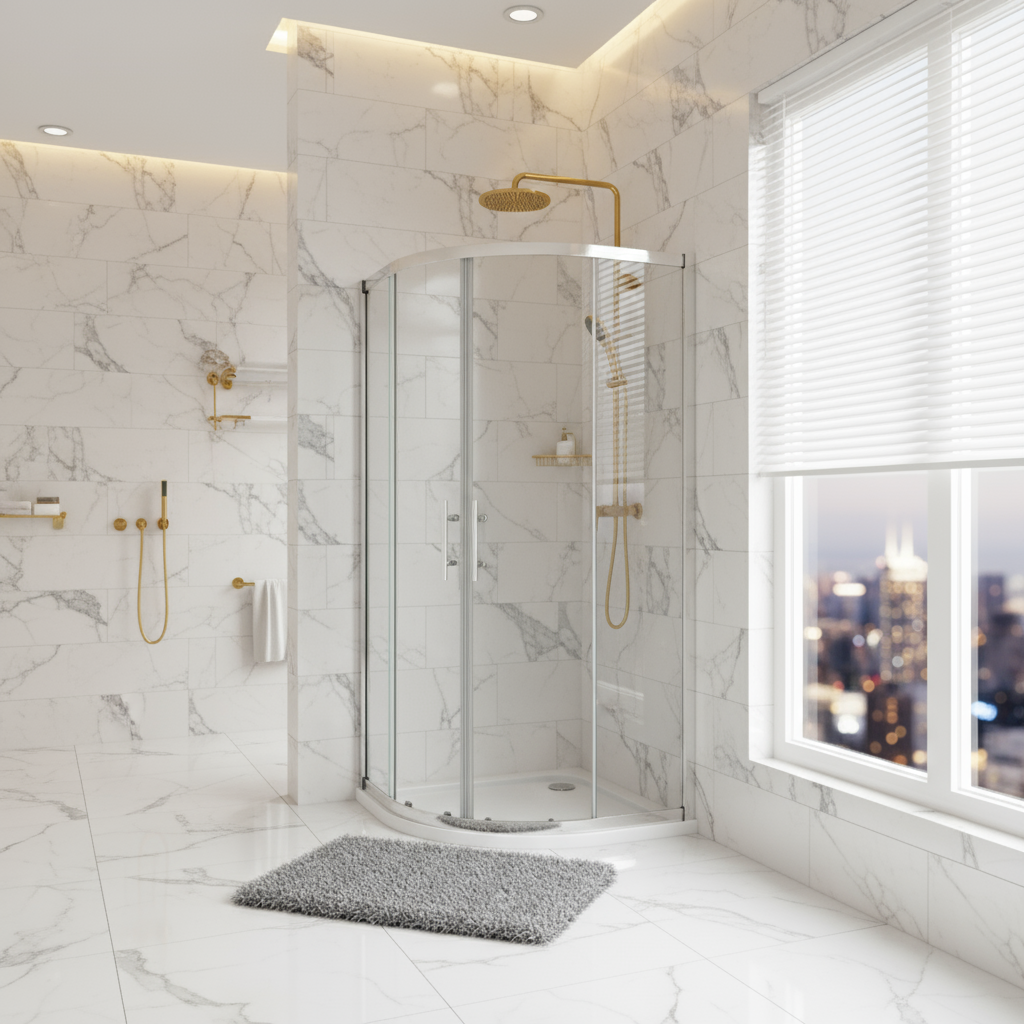 Die Viertelkreis Duschkabine 80×80 cm ist die ideale Wahl für kleine bis mittelgroße Badezimmer. Mit einer Höhe von 185 cm und stabilem 5mm ESG-Echtglas bietet sie Sicherheit, Funktionalität und modernes Design. Durch die Rundform fügt sich die Kabine platzsparend in jede Ecke ein.